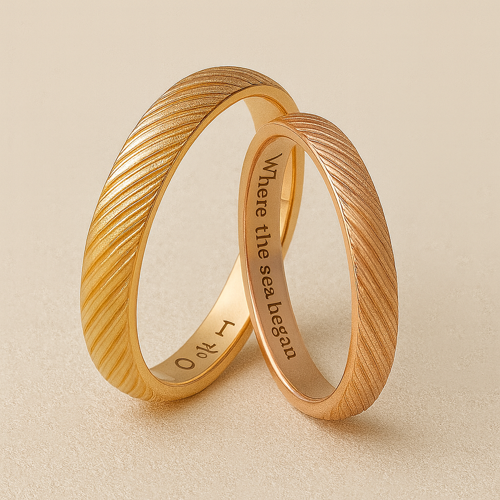 Oliver and Jia met during a beach clean-up. Years later, they turned that first meeting into a lifelong symbol — matching bands inspired by the texture of a seashell they once exchanged.