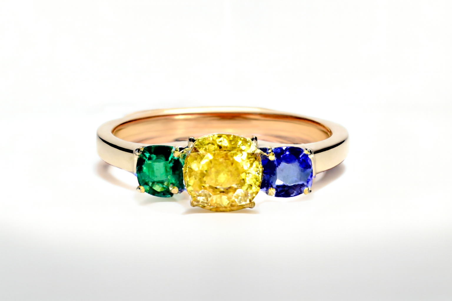 Marcus wanted an engagement ring that reflected his journeys with Isla — the skies, forests, and sunlight they shared. The designer crafted a three-stone ring with a yellow, green, and blue lab-grown diamond, symbolizing every horizon they’ve crossed together.
